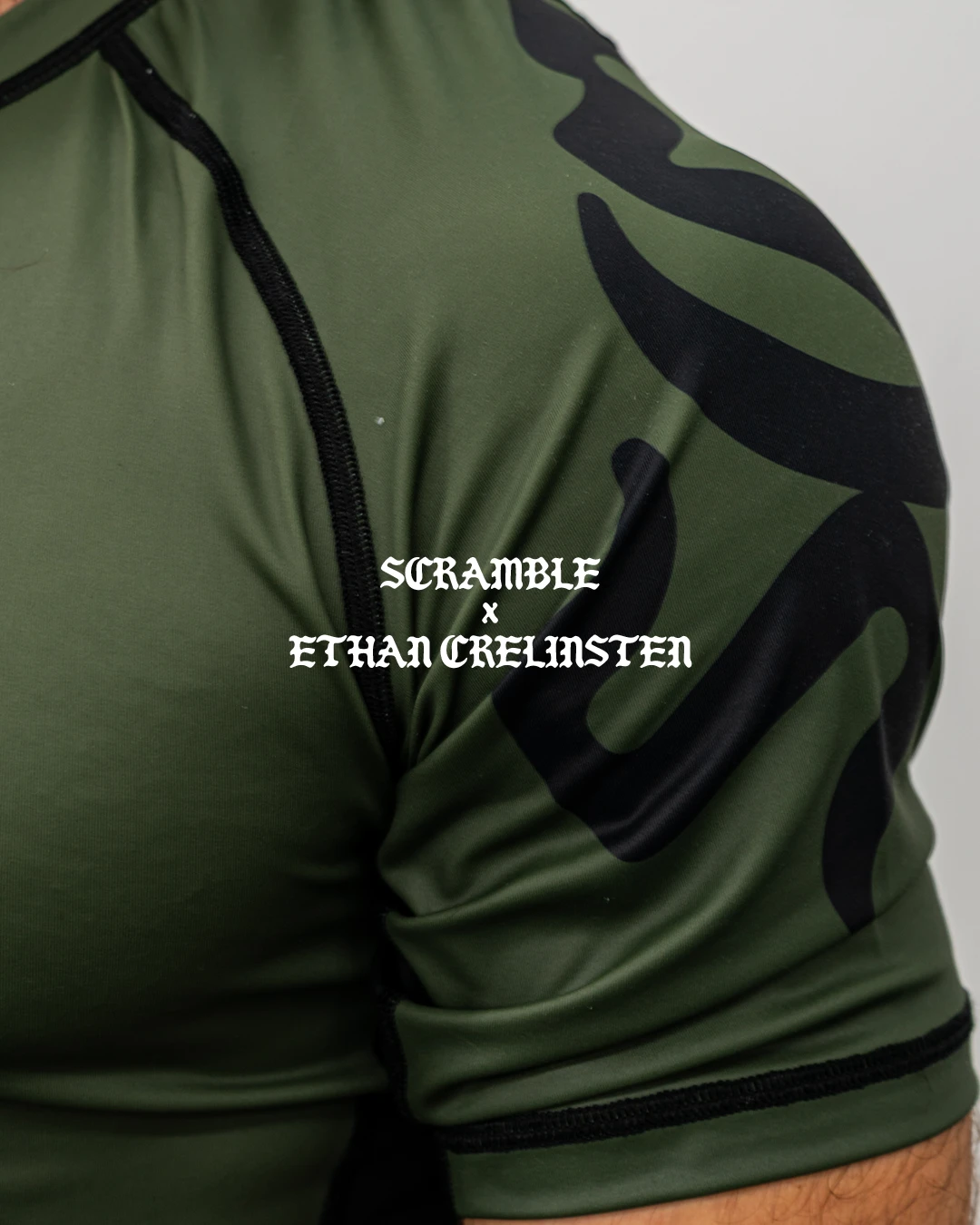Scramble athlete Ethan Crelinsten (formerly of Craig Jones’ B-Team, now of Simple Man Martial Arts – and before all that, a famed member of The Blue Basement, which John Danaher ran from Renzo Gracie NYC) loved the original black and white Glyph nogi rashguard so much, he asked us to put together a whole set in colours he chose. So, we have the Glyph set – which now includes shorts – in both Olive Green and Burnt Orange colourways. The Glyph set applies a simple gothic graphical theme and Scramble type treatment, which spans multiple panels across the garment, with a complimentary, smaller logo on the reverse side. Limited quantities, no restocks.