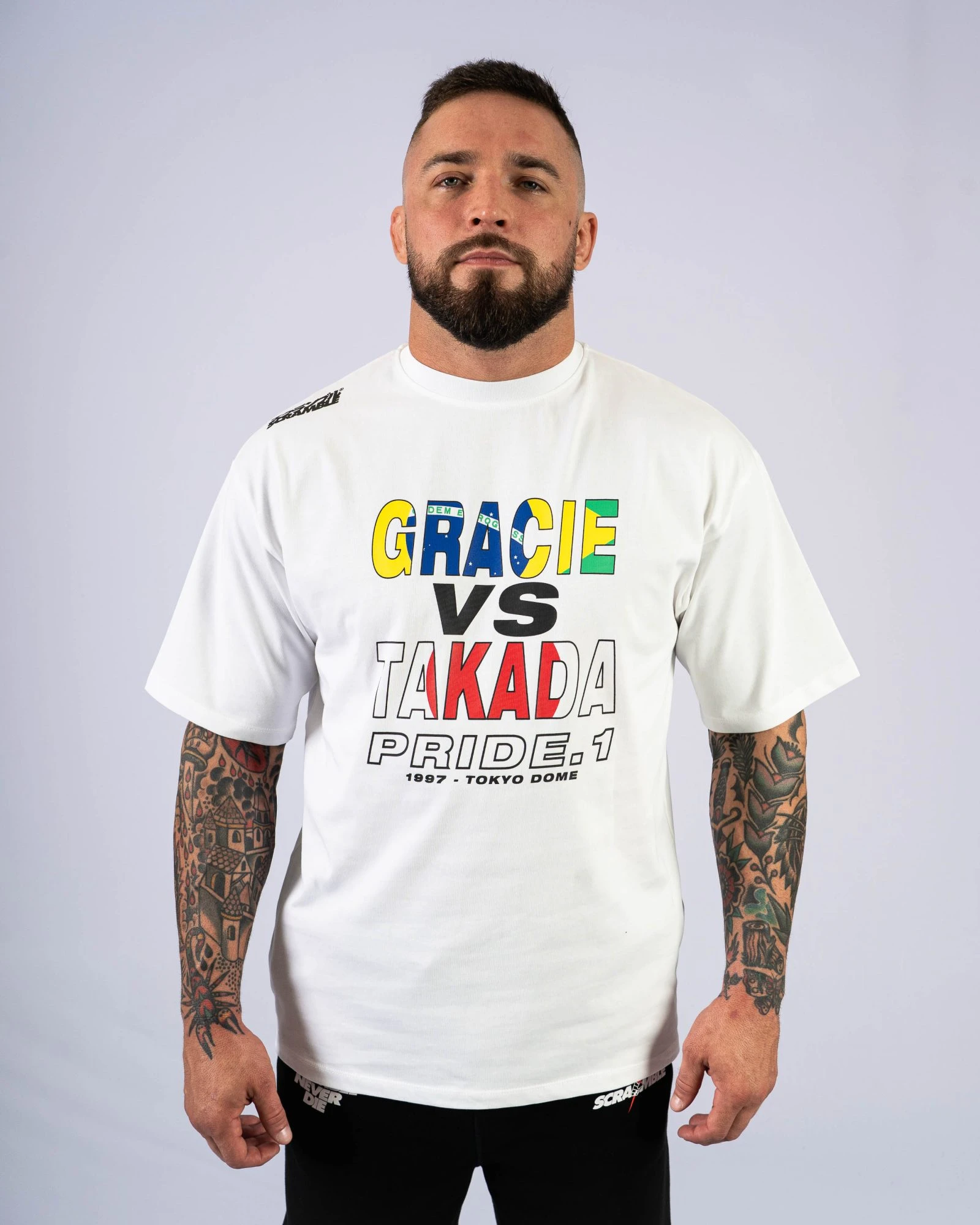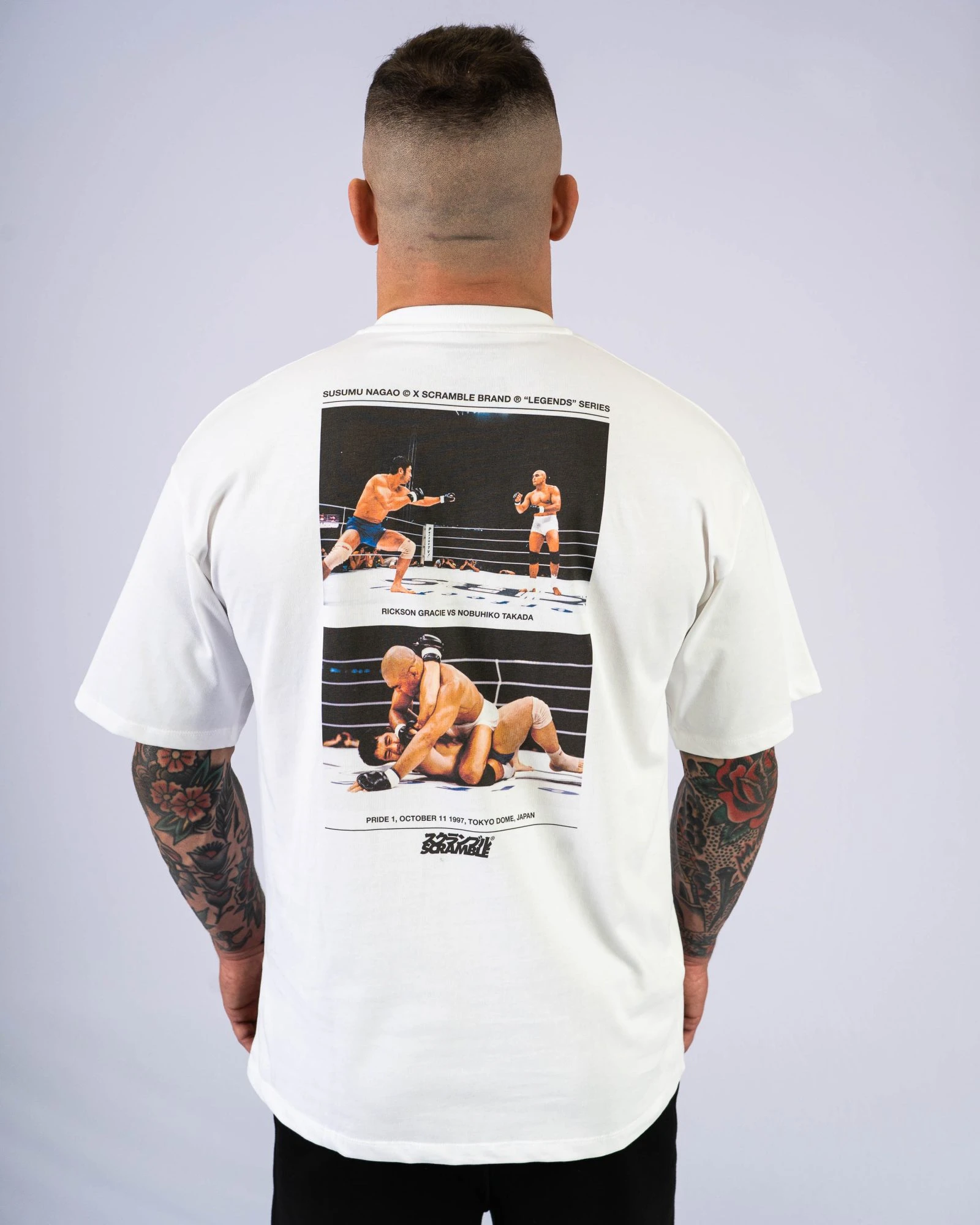 The match that kicked it all off – with Rickson Gracie being the unbeaten, legend-in-the-making from Brazil, the formidable fighter from the first family of MMA, and Takada being a Japanese folk hero and pro-wrestling superstar. This match catapulted Pride to the top of the MMA world, cementing it as a spectacle like no other. This t-shirt celebrates the headline match from this marquee event.
