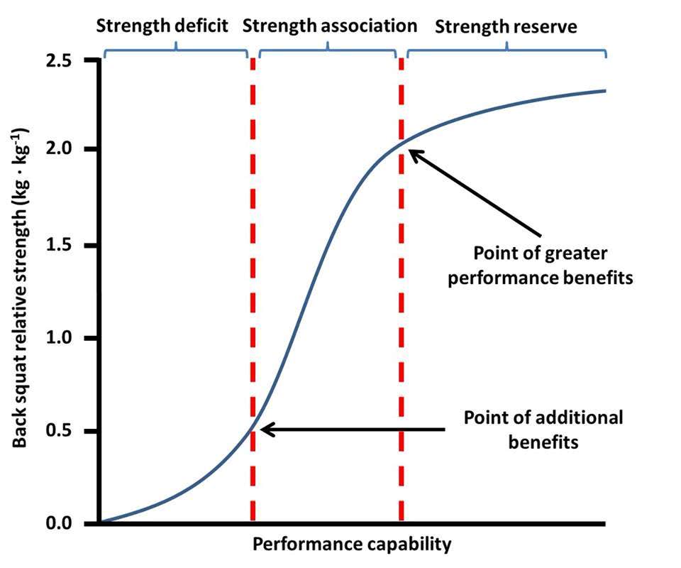 As you can see based on the above strength gains and performance effect really do seem to diminish at around twice bodyweight back squat. The squat being a good aggregate movement and a great measure of systemic strength. I often use front squats, deadlifts and pull-up standards to a similar effect.